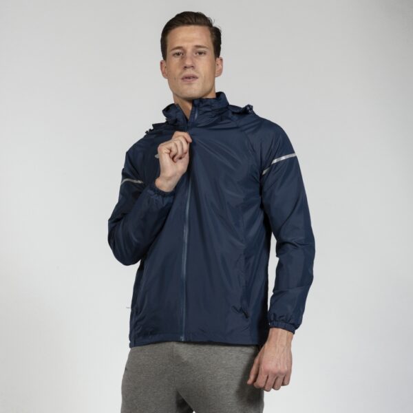 Jacheta de ploaie Joma Race, marin. Material impermeabil, încorporează elemente reflectorizante pe mâneci și îmbunătățim aerisirea datorită designului spatelui său. Hota invizibilă cu închidere elastică pentru o potrivire mai bună și buzunare laterale cu fermoar.
